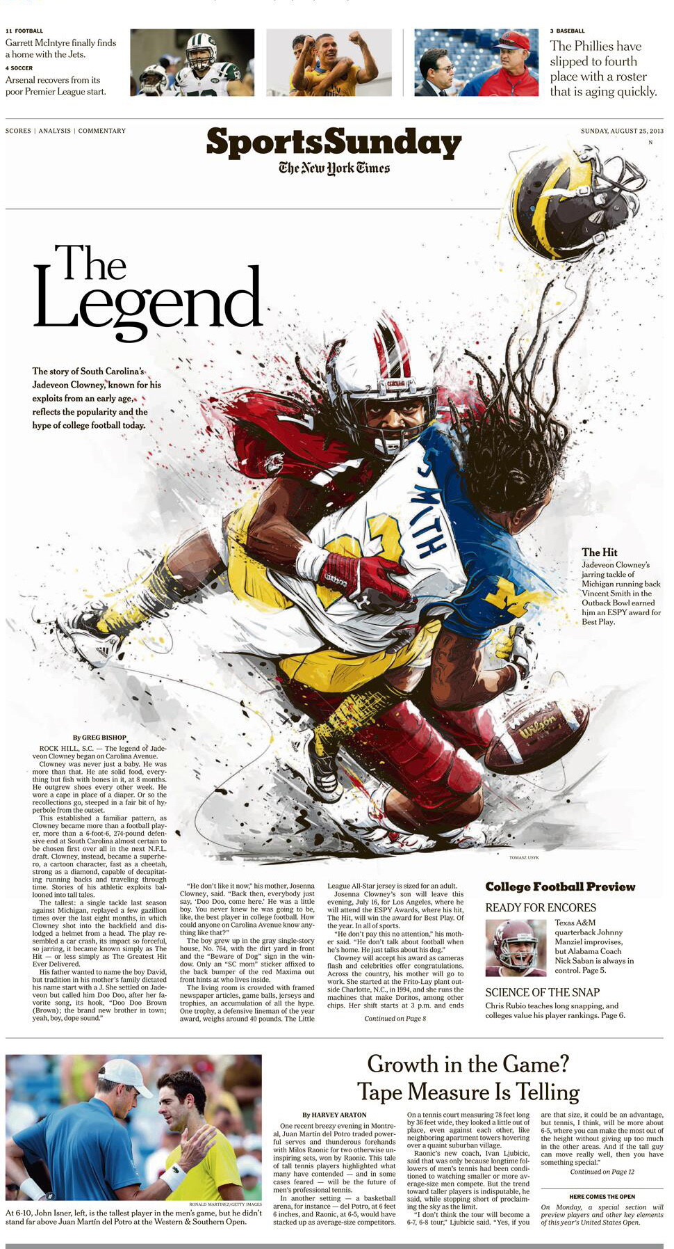 Illustration for NYT Sports Sunday's front page: The Legend of Jadeveon Clowney and 2013 College Football preview.