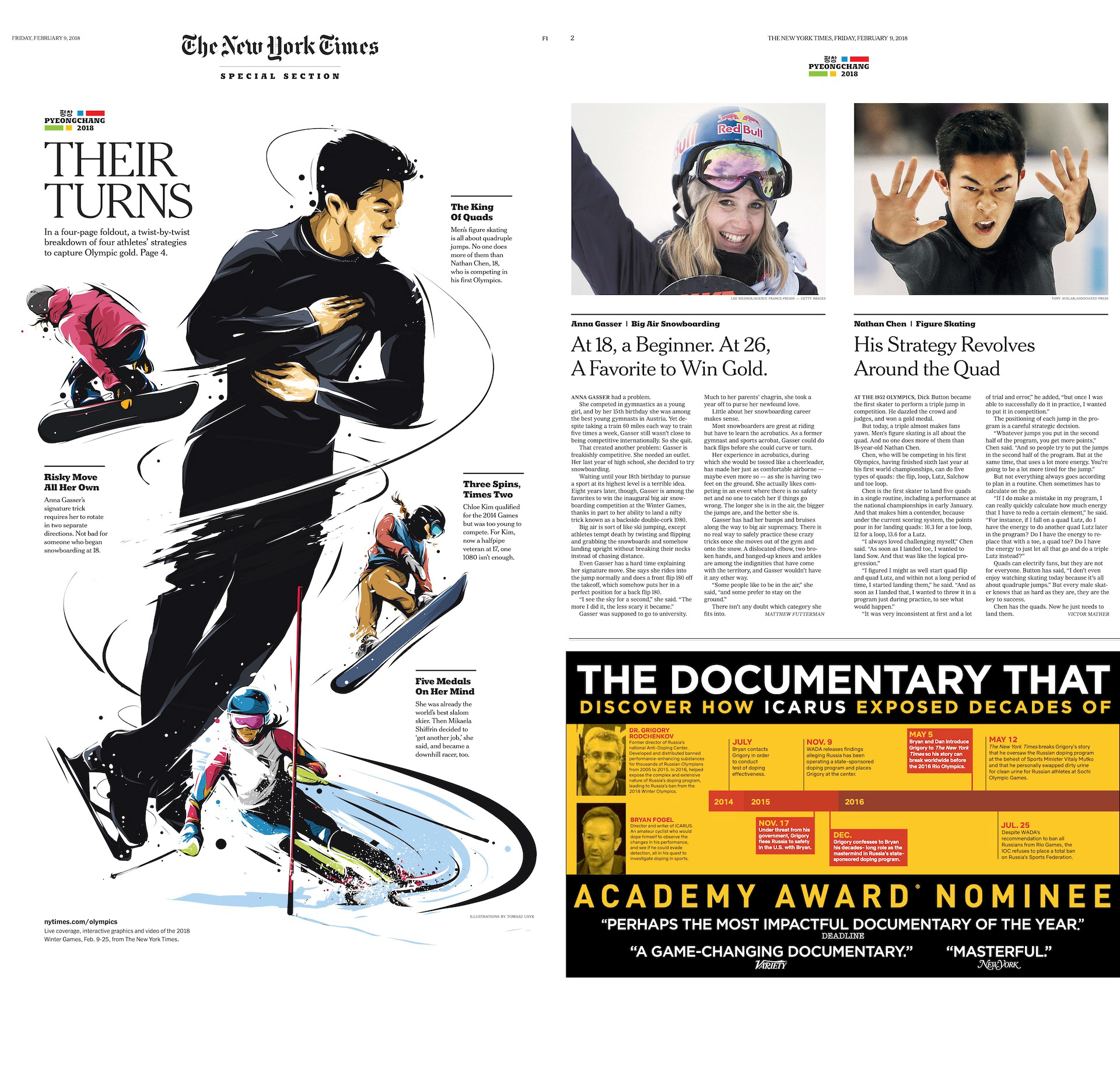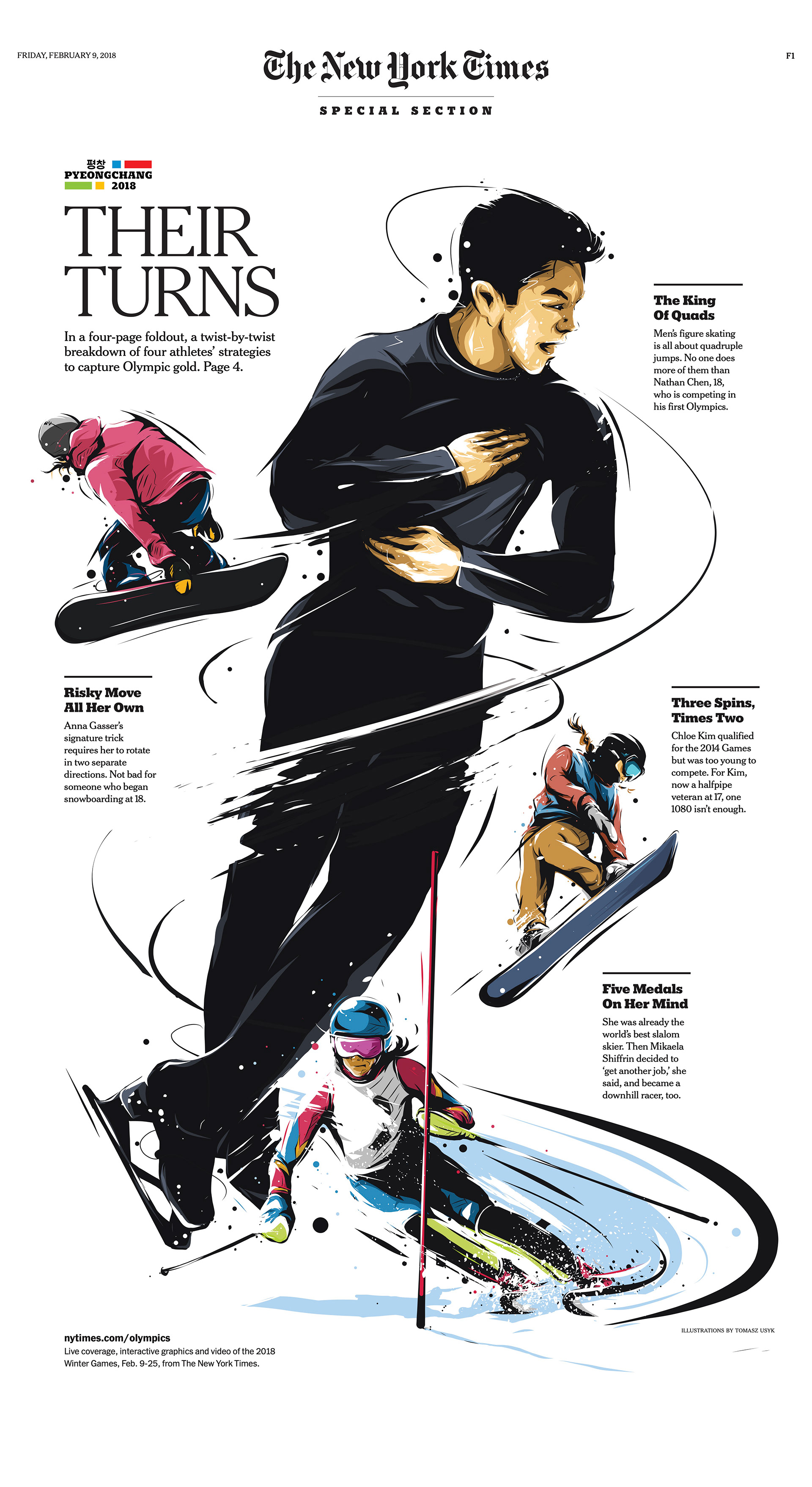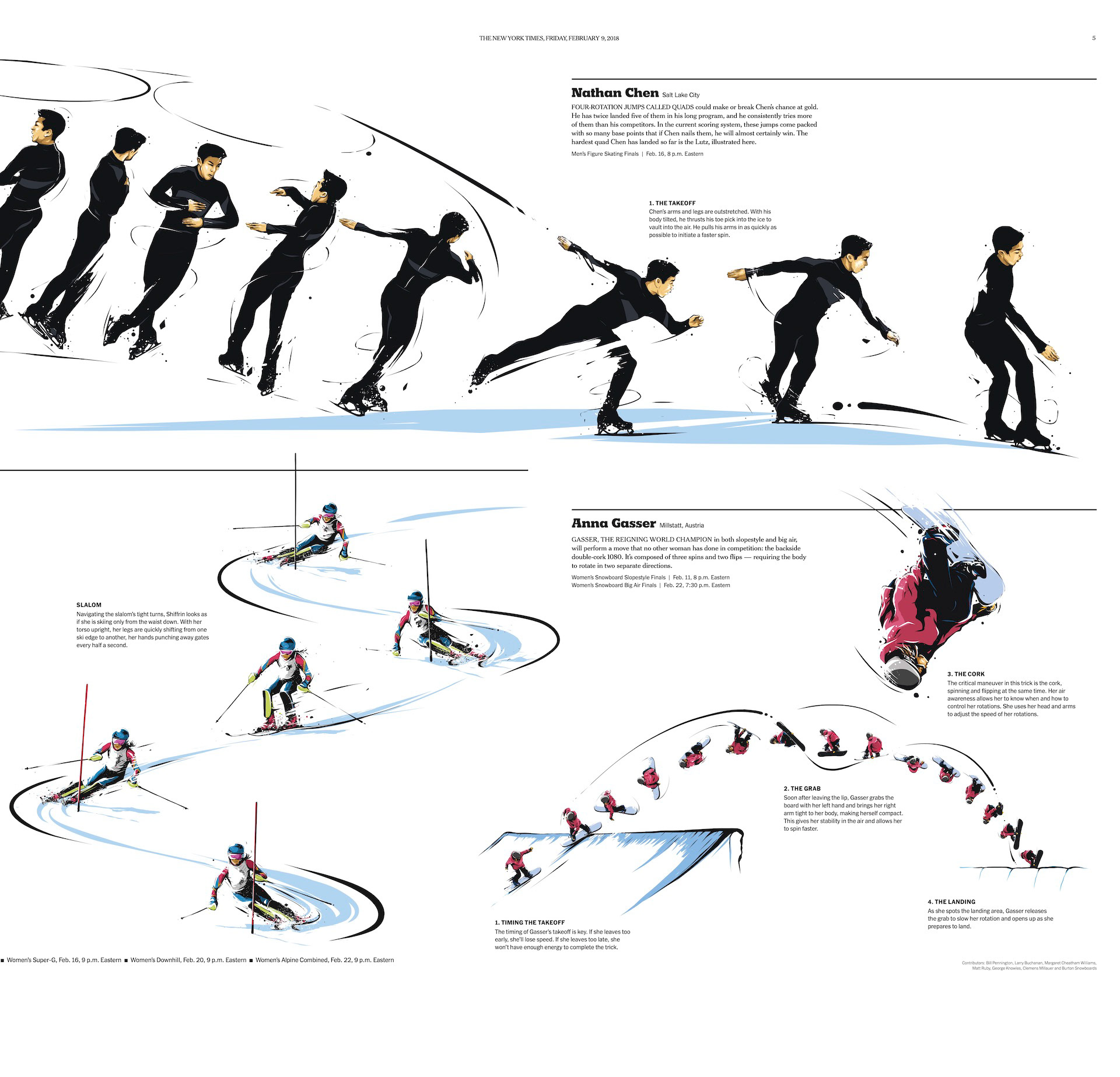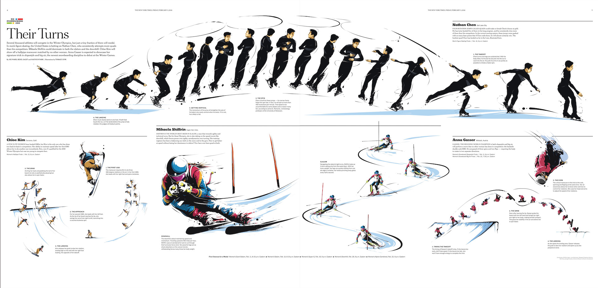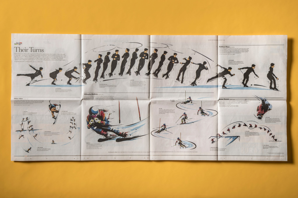 “Their Turns,” a special print section that breaks down the mechanics of Olympians’ spins, thrusts, flips and corkscrews, is The Times’s fifth editorial run of the “pano-8” format.